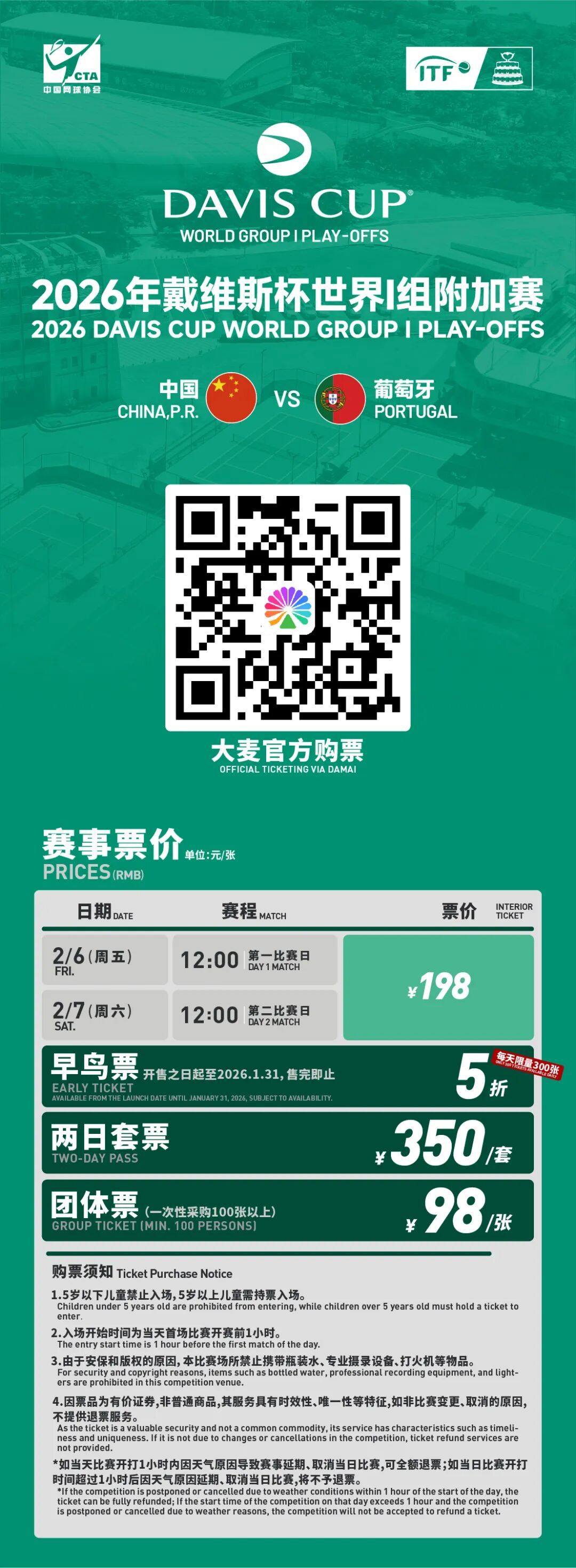 此外,赛事特别推出两日套票,350元即可观看全部比赛场次;团体购票同样享有优惠,一次性购买100张及以上,每张仅需98元。